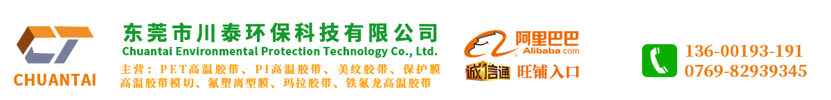 東莞市川泰環保科技有限公司是一家專業獨立開發.生產.銷售各種高溫綠色膠帶、高溫紅美紋膠帶、PET氟塑離型膜、冰箱膠帶、高低粘PET保護膜、PI高溫膠帶.PI高溫單面.雙面膠帶.醋酸膠布、PET夾芯雙面膠帶、銅鉑膠帶、鋁鉑膠帶、軟性線路板膠帶、PET薄膜單面(雙面)膠帶、遮噴膠帶等工業膠帶的獨資民營企業。